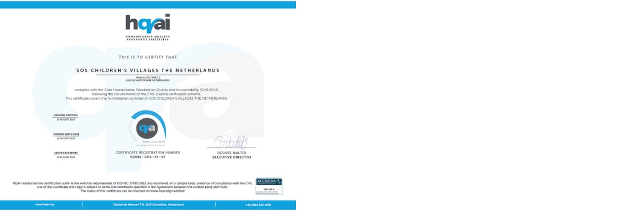 In augustus 2023 ontving SOS Kinderdorpen het CHS-certificaat, dankzij een succesvolle audit van de Humanitarian Quality Assurance Initiative (HQAI). Het certificaat, dat drie jaar geldig is, is een onafhankelijke bevestiging van de kwaliteit van het werk van SOS Kinderdorpen en onze verantwoordelijkheid ten opzichte van de mensen en gemeenschappen die door crises zijn getroffen.