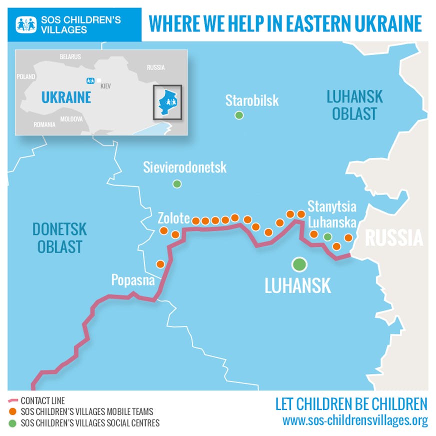 Door de dreigende situatie in Luhansk, waar SOS Kinderdorpen Oekraïne noodhulp verleent is het kantoor en sociaal centrum van sinds 17 februari gesloten. Door hevige beschietingen was het team genoodzaakt te verhuizen naar Sievierodonetsk. De ondersteuning op afstand van de gezinnen die in het noodhulpprogramma worden ondersteund, zal zoveel mogelijk worden voortgezet.